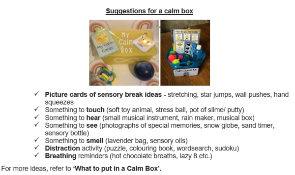• Identify a range of calming and alerting strategies that support them (known as their personal ‘toolkit’.)